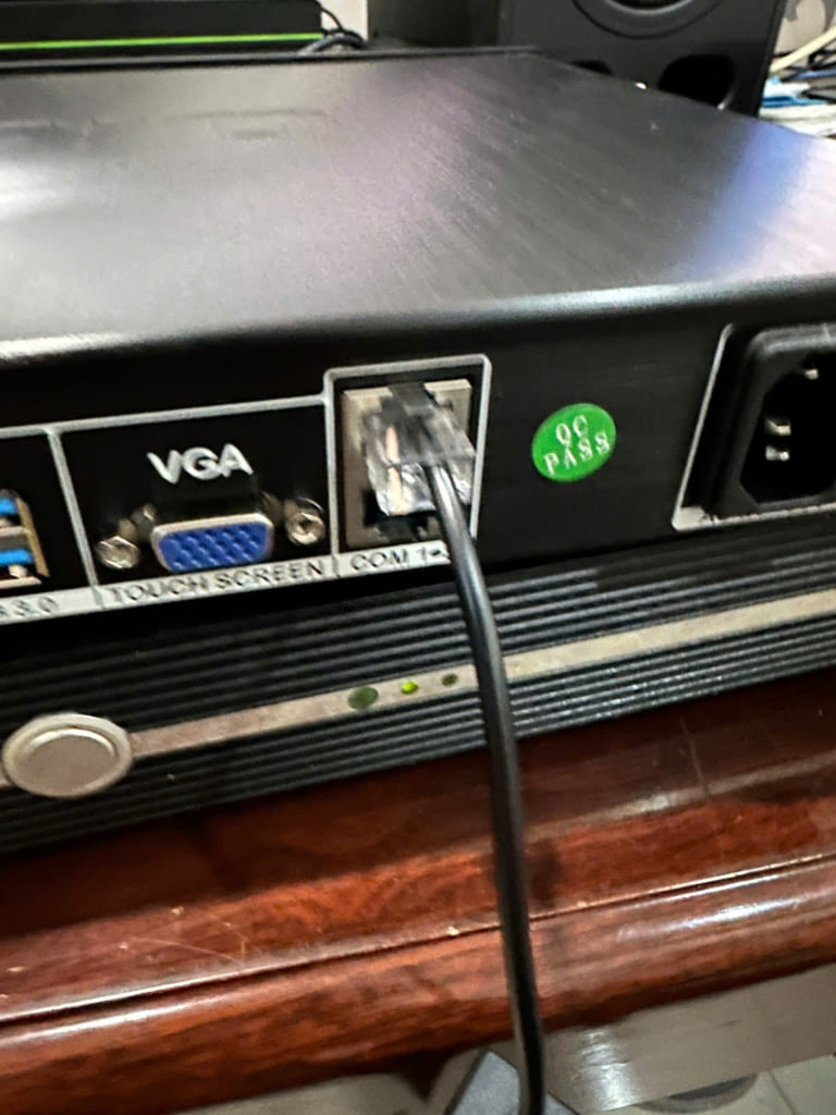 - Sau đó ta cắm dây key này vô cổng COM1 (cổng trên) ở phía sau đầu Okara M15I là có thể sử dụng bình thường.