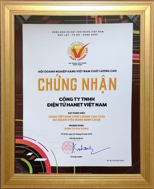 Ngày 20.02.2019, lễ công bố Hàng Việt Nam chất lượng cao năm 2019 đã diễn ra long trọng tại The Adora, số 431 Hoàng Văn Thụ, P. 4, Quận Tân Bình, Công ty điện tử HANET Việt Nam (HANET) vinh dự được trao tặng danh hiệu Hàng Việt Nam Chất Lượng Cao do người tiêu dùng bình chọn. Đây là năm thứ 3 liên tiếp HANET vinh dự nhận danh hiệu cao quý này (2017, 2018, 2019).